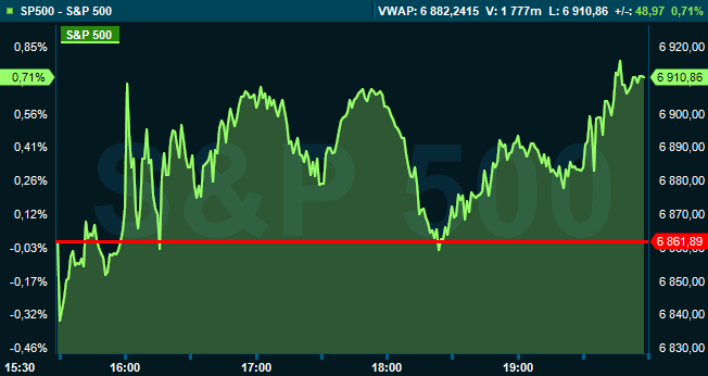 Vid 20.00-tiden var Dow Jones industriindex upp 0,4 procent till 49.588, medan breda S&P 500 steg 0,7 procent till 6.910. Tekniktunga Nasdaq Composite avancerade 1,0 procent till 22.919.