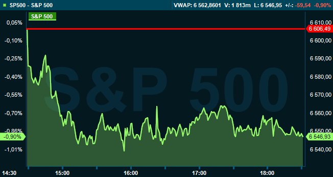 Klockan 18.30 handlades Dow Jones industriindex ned 0,6 procent till 45.761 medan breda S&P 500 sjönk 0,9 procent till 6.546. Det tekniktunga Nasdaq Composite föll 1,5 procent till 21.751.