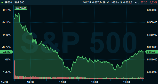 Vid 19.30-tiden var Dow Jones industriindex ned 1,3 procent till 48.969, medan breda S&P 500 sjönk 0,8 procent till 6.853. Tekniktunga Nasdaq Composite backade 0,9 procent till 22.686.