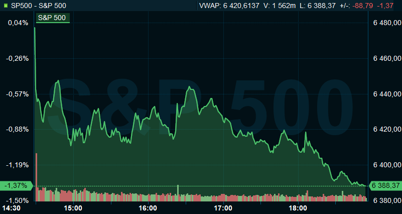 Vid 18.50-tiden sjönk Dow Jones industriindex 1,4 procent till 45.334, samtidigt som breda S&P 500 var ned 1,4 procent till 6.389. Det tekniktunga Nasdaq Composite backade 2 procent till 20.990.