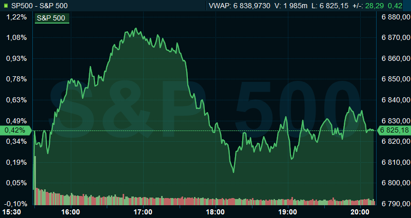 Vid 20-tiden var breda S&P upp 0,5 procent till 6.832. Dow Jones industriindex steg samtidigt med 0,7 procent till 48.801 och det tekniktunga Nasdaq Composite avancerade 0,4 procent till 23.038.
