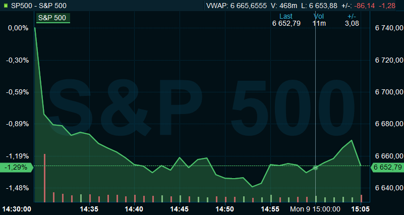 Vid 15-tiden handlades Dow Jones industriindex ned 1,5 procent till 46,814, medan breda S&P 500 sjönk 1,3 procent till 6.650. Det tekniktunga Nasdaq Composite backade 1,3 procent till 22.117.