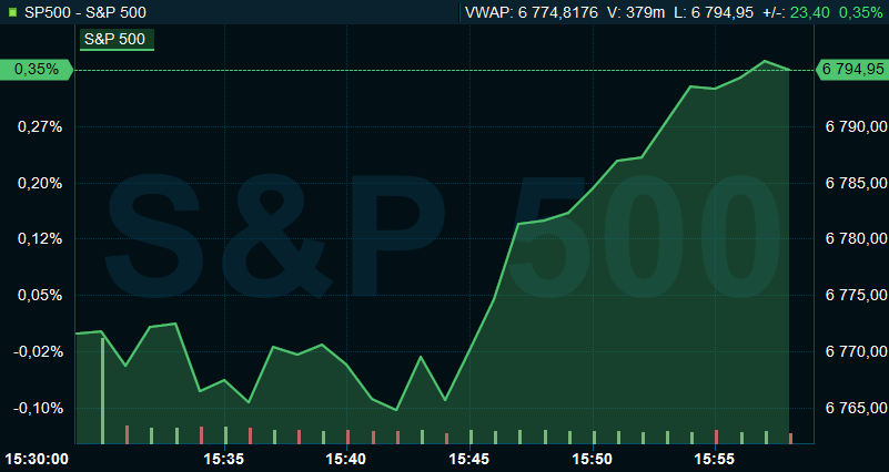 Vid 15.55-tiden var Dow Jones industriindex upp 0,4 procent till 47.250, medan breda S&P 500 steg 0,3 procent vid 6.793. Även tekniktunga Nasdaq Composite avancerade 0,5 procent till 23.467.