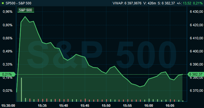 Vid 16.10-tiden steg Dow Jones industriindex 0,5 procent till 45.327, samtidigt som breda S&P 500 var upp 0,3 procent till 6.377. Det tekniktunga Nasdaq Composite steg med 0,2 procent till 20.982.
