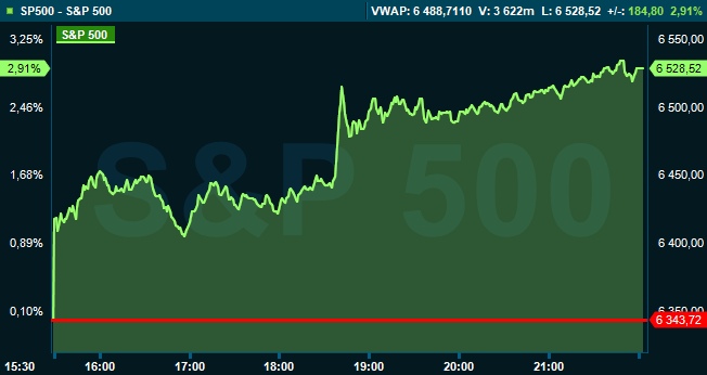 Vid stängning var breda S&P 500 upp 2,9 procent till 6.528, och räknat från Stockholmsbörsens stängning hade indexet stigit med 1,5 procent. Dow Jones industriindex var upp 2,5 procent till 46.341, medan Nasdaq Composite avancerade 3,8 procent till 21.590.