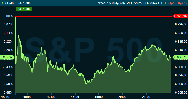 Vid börsstängning var breda S&P 500 ned 0,4 procent till 6.905, och räknat från Stockholmsbörsens stängning hade indexet stigit med 0,1 procent. Dow Jones industriindex föll med 0,5 procent till 48.461, medan det tekniktunga Nasdaq Composite försvagades med 0,5 procent till 23.474.