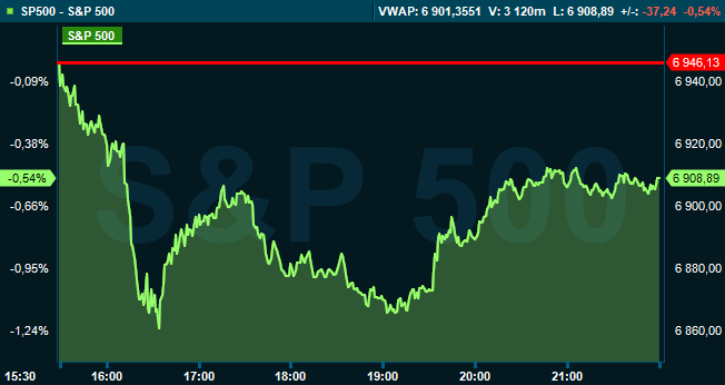 Vid stängning var S&P 500 ned 0,5 procent till 6.908, och räknat från Stockholmsbörsens stängning hade indexet stigit med 0,1 procent. Dow Jones industriindex var oförändrad vid 49.499 och Nasdaq Composite backade med 1,2 procent till 22.878.