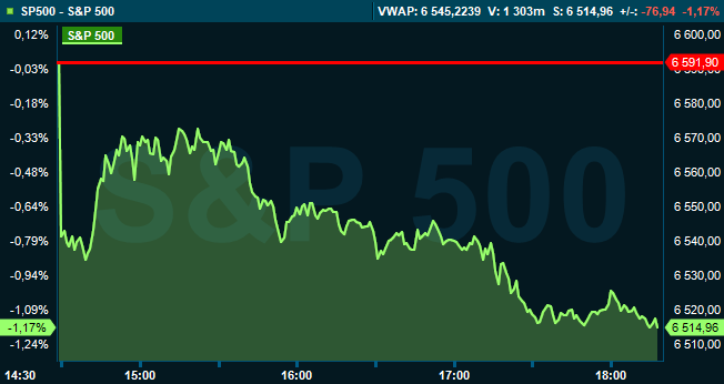 Klockan 18.20 handlades Dow Jones industriindex ned 0,8 procent till 46.080, medan breda S&P 500 föll 1,2 procent till 6.514. Det tekniktunga Nasdaq Composite backade med 1,6 procent till 21.580.