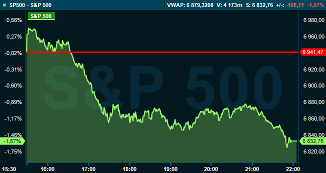 Vid stängning var S&P 500 ned 1,6 procent till 6.832, och räknat från Stockholmsbörsens stängning hade indexet sjunkit 0,4 procent. Dow Jones industriindex sjönk 1,3 procent till 49.451, medan Nasdaq Composite försvagades med 2,0 procent till 22.597.