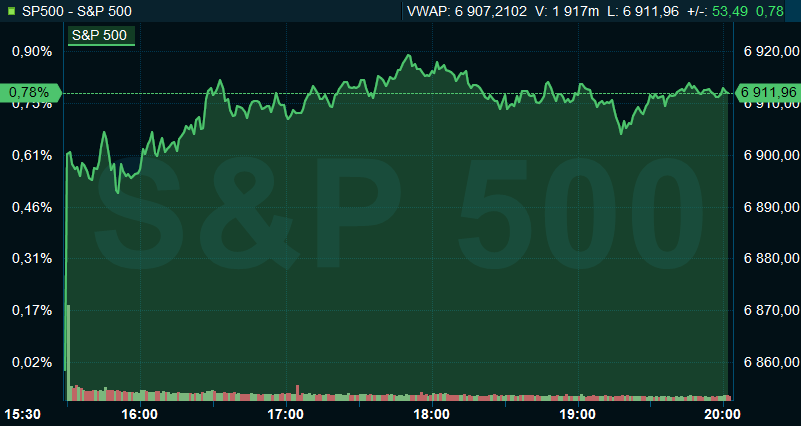 Vid 20-tiden var Dow Jones industriindex upp 1,7 procent till 49.195, medan breda S&P 500 steg 0,8 procent till 6.911. Tekniktunga Nasdaq Composite avancerade 0,8 procent till 23.415.