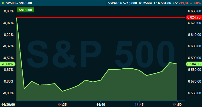 Klockan 14.50 handlades Dow Jones industriindex ned 0,3 procent till 46.072, medan breda S&P 500 föll 0,6 procent till 6.589. Det tekniktunga Nasdaq Composite sjönk med 0,7 procent till 21.995.