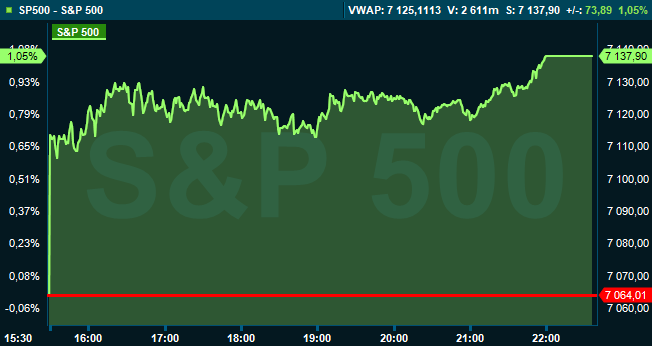 Vid stängning var S&P 500 upp 1,1 procent till 7.137, och räknat från Stockholmsbörsens stängning hade indexet stigit med 0,1 procent. Dow Jones industriindex lyftes 0,7 procent till 49.490 och teknikdominerade Nasdaqs kompositindex steg 1,6 procent till 24.657.