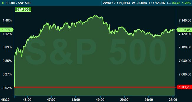 S&P 500 passerade under dagen 7.100-nivån för första gången, och vid stängning var indexet upp 1,2 procent till 7.126. Räknat från Stockholmsbörsens stängning hade indexet sjunkit med 0,1 procent. Dow Jones industriindex lyfte 1,8 procent till 49.447 och teknikdominerade Nasdaqs kompositindex avancerade 1,5 procent till 24.468.