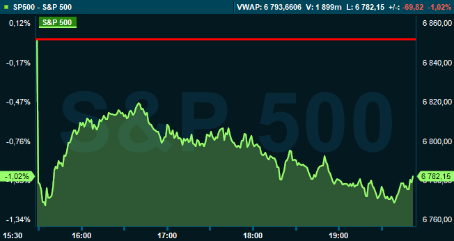 Vid 19:45-tiden var Dow Jones industriindex ned 0,6 procent till 47.036, medan breda S&P 500 var ned 1,0 procent vid 6.782. Även tekniktunga Nasdaq Composite sjönk med 1,8 procent till 23.434.