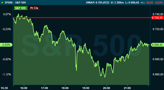 Vid börsstängning var breda S&P 500 ned 0,5 procent till 6.699, och räknat från Stockholmsbörsens stängning var indexet oförändrat. Dow Jones industriindex sjönk 0,7 procent till 46.590, samtidigt som tekniktunga Nasdaq Composite försvagades med 0,9 procent till 22.740.