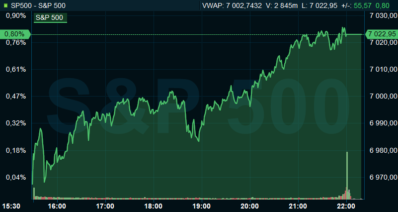 Vid stängning hade S&P 500 avancerat 0,8 procent till 7.022, och räknat från Stockholmsbörsens stängning hade indexet stigit med 0,4 procent. Dow Jones industriindex sjönk i stället med 0,2 procent till 48.463 och teknikdominerade Nasdaqs kompositindex lyfte 1,6 procent till 24.016.