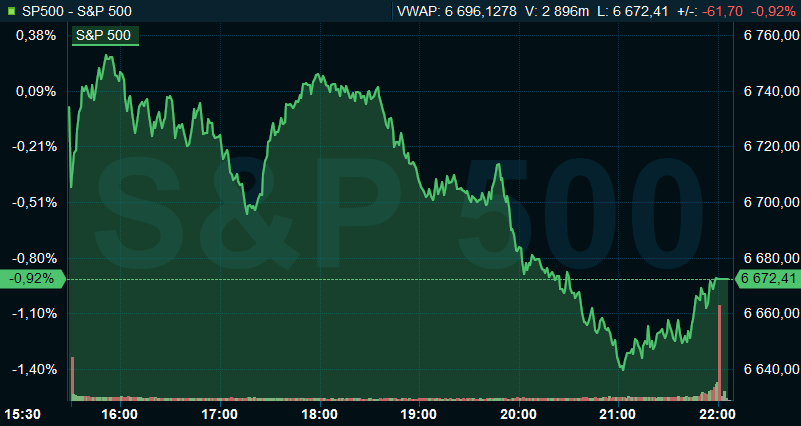 Vid börsstängning var breda S&P 500 ned 0,9 procent till 6.673, och räknat från Stockholmsbörsens stängning hade indexet sjunkit 0,7 procent. Dow Jones industriindex sjönk 1,2 procent till 46.590, samtidigt som tekniktunga Nasdaq Composite backade med 0,8 procent till 22.708.
