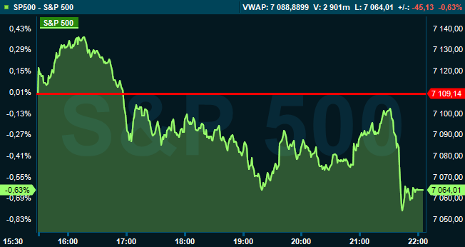 Vid stängning hade samtliga tre huvudindex fallit med 0,6 procent vardera. S&P 500 backade 0,6 procent till 7.064, vilket motsvarade en nedgång på 0,4 procent räknat från Stockholmsbörsens stängning. Dow Jones industriindex sjönk till 49.149, medan Nasdaq Composite backade till 24.259.