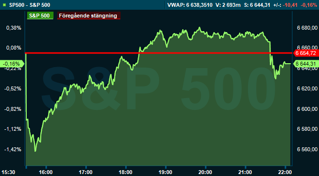 Vid börsstängning var breda S&P 500 ned 0,2 procent till 6.644, och räknat från Stockholmsbörsens stängning hade indexet stigit 0,3 procent. Dow Jones industriindex steg 0,4 procent till 46.270, samtidigt som tekniktunga Nasdaq Composite försvagades med 0,8 procent till 22.521.