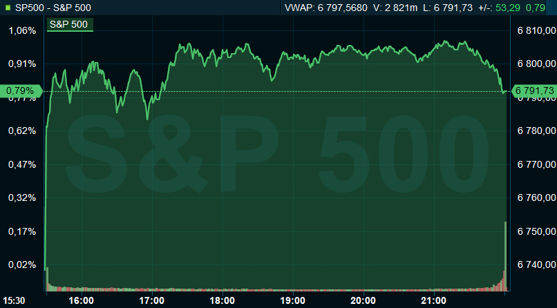 Vid börsstängning var breda S&P 500 upp 0,8 procent till 6.791, och räknat från Stockholmsbörsens stängning hade indexet sjunkit 0,2 procent. Dow Jones industriindex steg 1,0 procent till 47.207, samtidigt som tekniktunga Nasdaq Composite stärktes med 1,2 procent till 23.204.