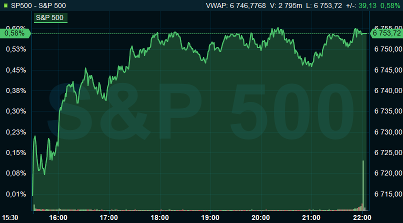 Vid börsstängning var breda S&P 500 upp 0,6 procent till 6.753, och räknat från Stockholmsbörsens stängning hade indexet stigit 0,1 procent. Dow Jones industriindex var oförändrad på nivån 46.601, samtidigt som tekniktunga Nasdaq Composite avancerade med 1,1 procent till 23.043.