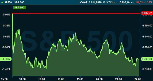Vid börsstängning var breda S&P 500 ned 1,2 procent till 6.798 och räknat från Stockholmsbörsens stängning hade indexet sjunkit 0,3 procent. Dow Jones industriindex föll samtidigt med 1,2 procent till 48.908 medan det tekniktunga Nasdaq Composite backade 1,6 procent till 22.540.