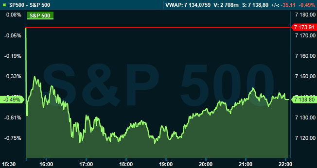 Vid stängning hade S&P 500 backat 0,5 procent till 7.138, och räknat från Stockholmsbörsens stängning hade indexet stigit med 0,2 procent. Dow Jones industriindex var ned 0,1 procent till 49.136 och teknikdominerade Nasdaqs kompositindex sjönk 0,9 procent till 24.663.