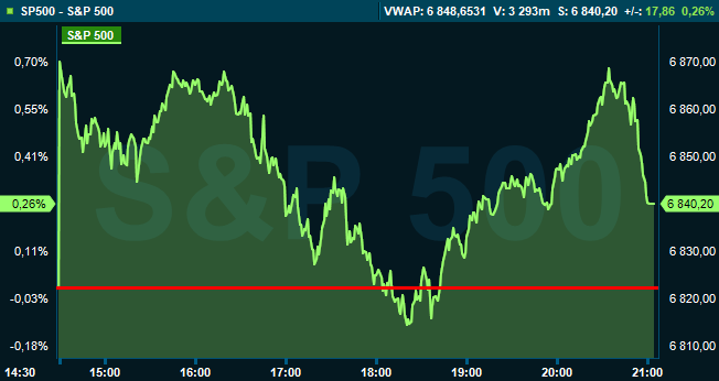 Vid börsstängning var breda S&P 500 upp 0,3 procent till 6.840, och räknat från Stockholmsbörsens stängning var indexet oförändrat. Dow Jones industriindex steg 0,1 procent till 47.562, samtidigt som tekniktunga Nasdaq Composite förstärktes med 0,6 procent till 23.724.