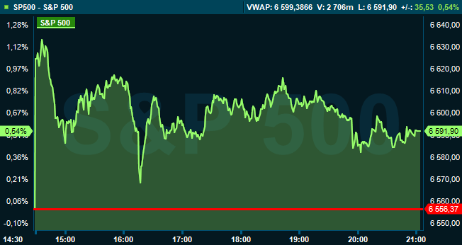Vid stängning var S&P 500 upp 0,5 procent till 6.591, och räknat från Stockholmsbörsens stängning hade indexet sjunkit med 0,1 procent. Dow Jones industriindex avancerade 0,7 procent till 46.428, medan Nasdaq Composite steg 0,8 procent till 21.929.