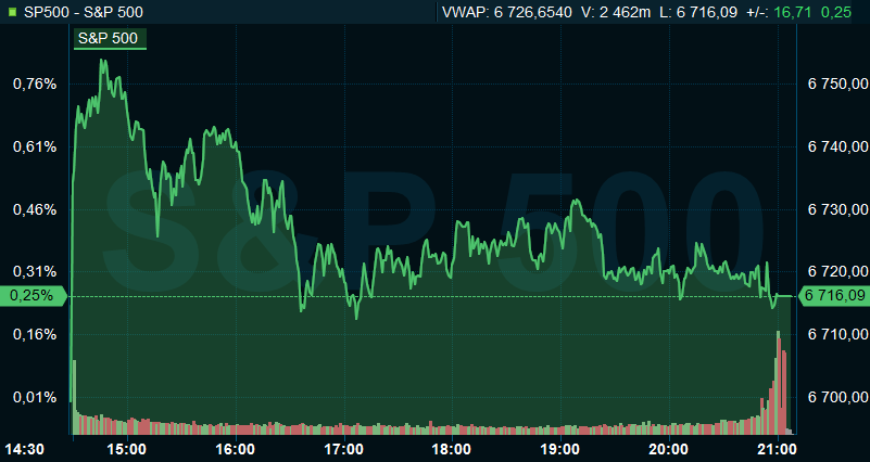 Vid stängning var S&P 500 upp 0,3 procent till 6.716, och räknat från Stockholmsbörsens stängning hade indexet sjunkit marginellt. Dow Jones industriindex avancerade med blygsamma 0,1 procent till 46.993, medan Nasdaq Composite var upp 0,5 procent till 22.479.