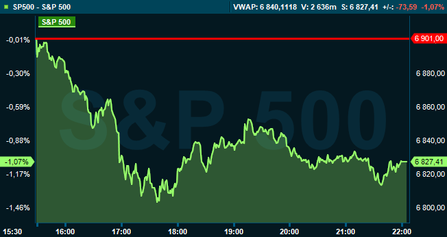Vid stängning hade S&P 500 sjunkit 1,1 procent till 6.827, och räknat från Stockholmsbörsens stängning hade indexet stigit med 0,1 procent. Dow Jones industriindex var ned 0,5 procent till 48.457 och Nasdaq Composite hade sjunkit 1,7 procent till 23.195.