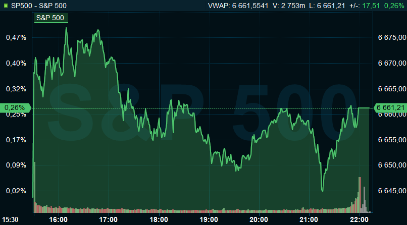 Vid börsstängning var breda S&P 500 upp 0,3 procent till 6.661, och räknat från Stockholmsbörsens stängning var indexet oförändrad. Dow Jones industriindex steg 0,2 procent till 45.316, samtidigt som tekniktunga Nasdaq Composite stärktes med 0,5 procent till 22.591.