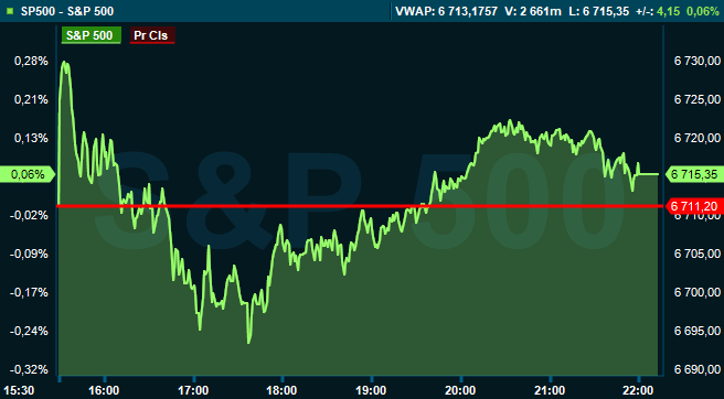 Vid börsstängning var breda S&P 500 upp 0,1 procent till 6.715, och räknat från Stockholmsbörsens stängning hade indexet stigit 0,2 procentenheter. Dow Jones industriindex steg 0,2 procent till 46.520, samtidigt som tekniktunga Nasdaq Composite stärktes med 0,4 procent till 22.844.