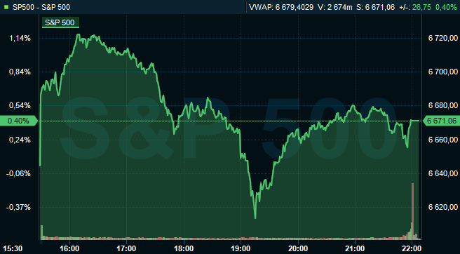 Vid börsstängning var breda S&P 500 upp 0,4 procent till 6.671, och räknat från Stockholmsbörsens stängning hade indexet sjunkit 0,4 procent. Dow Jones industriindex var oförändrad på 46.253, samtidigt som tekniktunga Nasdaq Composite stärktes med 0,7 procent till 22.670.