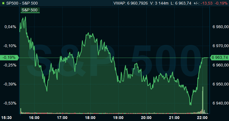 Vid stängning sjönk S&P 500 0,20 procent till 6.963, och räknat från Stockholmsbörsens stängning var indexet oförändrat. Dow Jones industriindex var ned 0,8 procent till 49.191 och Nasdaq Composite hade backade 0,1 procent till 23.709.