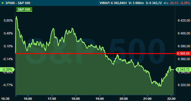 Vid stängning var S&P 500 ned 0,4 procent till 6.343, och räknat från Stockholmsbörsens stängning hade indexet sjunkit med 0,7 procent. Dow Jones industriindex steg 0,1 procent till 45.216, medan Nasdaq Composite backade 0,7 procent till 20.794.