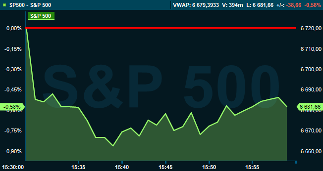 Vid 16-tiden var Dow Jones industriindex ned 0,2 procent till 46.818 medan breda S&P 500 hade sjunkit 0,5 procent till 6.684. Det tekniktunga Nasdaq Composite backade 1 procent till 22.822.