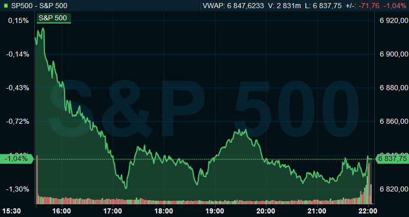 Vid stängning var S&P 500 ned 1,0 procent till 6.837, och räknat från Stockholmsbörsens stängning hade indexet sjunkit med 0,1 procent. Dow Jones industriindex sjönk 1,7 procent till 48.804 och Nasdaq Composite backade med 1,1 procent till 22.627.