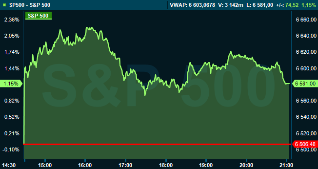Vid stängning var S&P 500 upp 1,2 procent till 6.581, och räknat från Stockholmsbörsens stängning hade indexet stigit med 0,2 procent. Dow Jones industriindex avancerade 1,4 procent till 46.208, medan Nasdaq Composite var upp 1,4 procent till 21.946.