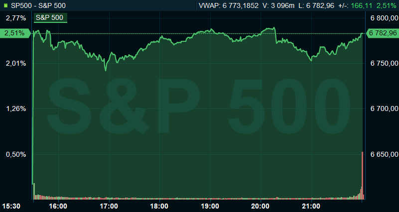 Vid stängning hade S&P 500 avancerat 2,5 procent till 6.782, och räknat från Stockholmsbörsens stängning hade indexet stigit med 0,4 procent. Dow Jones industriindex steg 2,9 procent till 47.910 och teknikdominerade Nasdaqs kompositindex var upp 2,8 procent till 22.635.