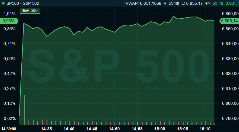 Vid 15.10-tiden var Dow Jones industriindex upp 0,6 procent till 47.509, medan breda S&P 500 avancerade 0,9 procent till 6.855. Tekniktunga Nasdaq Composite steg 1,5 procent till 23.552.