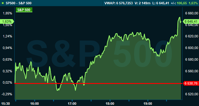 Vid 19.50-tiden var Dow Jones industriindex upp 1,6 procent till 46.530, medan breda S&P 500 steg 1,7 procent till 6.645. Tekniktunga Nasdaq Composite lyfte 1,7 procent till 22.437.