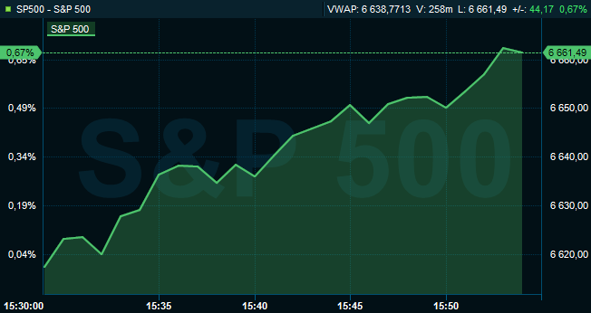 Strax innan klockan 16 på onsdagen var Dow Jones industriindex oförändrad kring 46.113, medan breda S&P 500 var upp med 0,7 procent till 6.662. Det tekniktunga Nasdaq Composite steg 1,2 procent till 22.689.