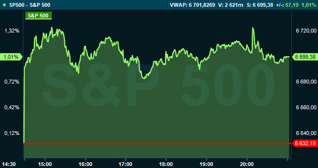Vid stängning var S&P 500 upp 1,0 procent till 6.699, och räknat från Stockholmsbörsens stängning hade indexet stigit med 0,2 procent. Dow Jones industriindex avancerade 0,8 procent till 46.946 och Nasdaq Composite var upp 1,2 procent till 22.374.