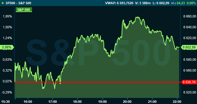 Vid börsstängning var breda S&P 500 upp 1,0 procent till 6.602, och räknat från Stockholmsbörsens stängning hade indexet stigit 0,4 procent. Dow Jones industriindex steg 1,1 procent till 46.245, samtidigt som tekniktunga Nasdaq Composite stärktes med 0,9 procent till 22.273.