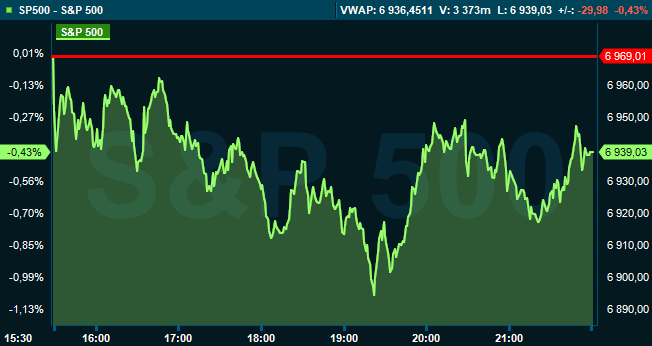 Vid stängning var S&P 500 ned 0,4 procent till 6.939, och räknat från Stockholmsbörsens stängning hade indexet stigit med 0,1 procent. Dow Jones industriindex sjönk 0,4 procent till 48.892 och Nasdaq Composite backade 0,9 procent till 23.461.