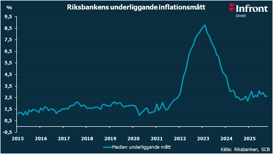 STOCKHOLM (Nyhetsbyrån Direkt) Medianen för Riksbankens underliggande inflationsmått var oförändrad på 2,6 procent i oktober jämfört med i september.