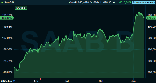 Aktien vände dock ned häromveckan när USA:s president Donald Trump sade att han inte kommer använda våld för att ta över Grönland. Sprickan mellan USA-administrationen och andra Nato-länder har emellertid medfört förväntningar om en miljö som kan gynna Saab ytterligare.