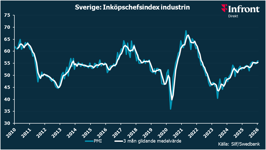 STOCKHOLM (Nyhetsbyrån Direkt) Inköpschefsindex för den svenska industrisektorn steg till 56,0 i januari, från 55,4 föregående månad. Det är sjunde månaden i rad över det historiska snittet på 54,3.