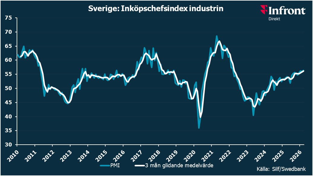 "Svensk industri fortsätter att uppvisa en robust utveckling men fallet i orderingången och tecken på leveransstörningar kan bli utmanande för svensk industri om kriget i Mellanöstern blir långvarigt", säger Jörgen Kennemar, ansvarig för analysen av inköpschefsindex på Swedbank.